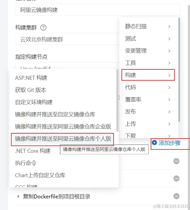 添加步骤->构建->镜像构建并推送至阿里云镜像仓库个人版类型
