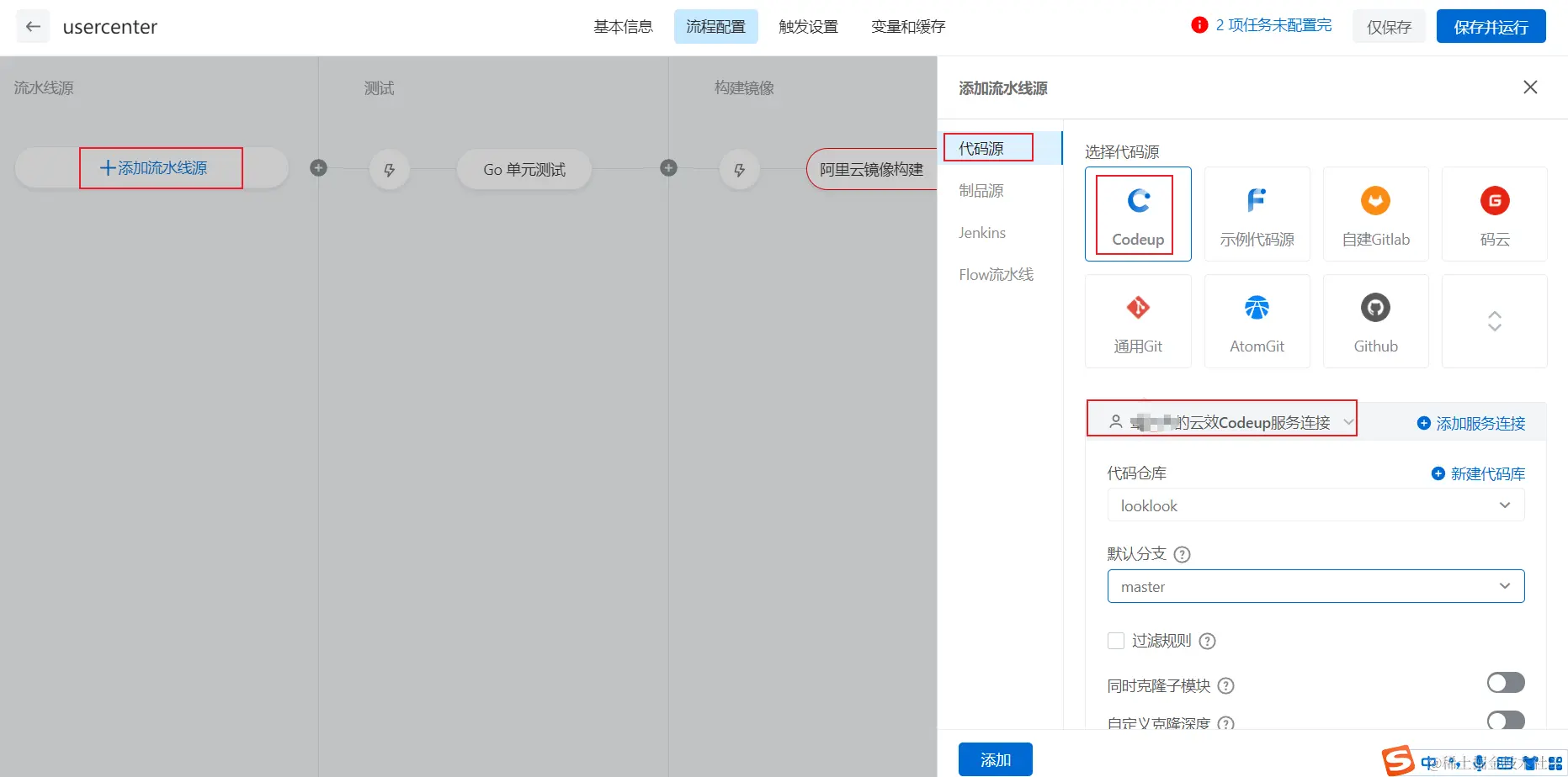 添加流水线源->代码源选择云效->添加云效服务连接->选择代码仓库和分支