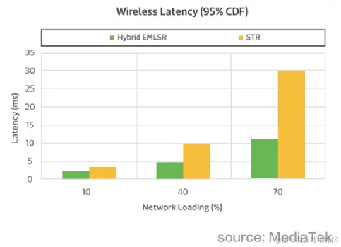 Another Wi-Fi chip provider, MediaTek, has proposed an MLO architecture called "Hybrid eMLSR". The principle of eMSLR is to connect three different frequency bands (2.4 GHz, 5 GHz, 6 GHz) through 2 Radio to transmit, one Radio only transmits 2.4 GHz and is set to STR mode, while the other Radio is set to eMSLR mode and transmits in the 5 GHz and 6 GHz frequency bands. Hybrid eMLSR achieves better performance than standard eMLSR. If At the same time, mixing different bandwidths for single-channel transmission is more helpful for improving the delay and throughput performance of the overall network system.