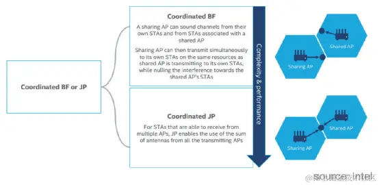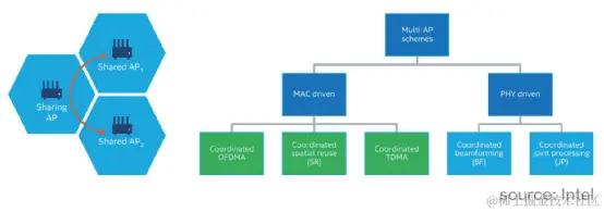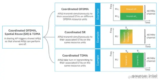 Multi-AP Operation has the following deployment methods, namely C-OFDMA (Coordinated Orthogonal Frequency Division Multiple Access), CSR (Coordinated Spatial Reuse), C-CDMA (Coordinated Collision Division Multiple Access), CBF (Coordinated Beamforming) and JXT (Joint Transmission)