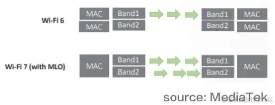 The Wi-Fi technology currently on the market allows a Wi-Fi device to use 2.4 GHz, 5 GHz or 6 GHz frequency bands to transmit data, but only one frequency band can be used at the same time, and switching between different frequency bands requires A certain switching time will cause delays in the network system. For some applications that are relatively sensitive to delays, such as wireless VR devices, real-time multiplayer high-definition online games, metaverse, etc..., how to reduce the delay time is an urgent need. To solve the problem, Wi-Fi 7's MLO technology has found a solution to this problem. The figure below illustrates that WiFi 7 MLO can transmit simultaneously through different frequency bands.
