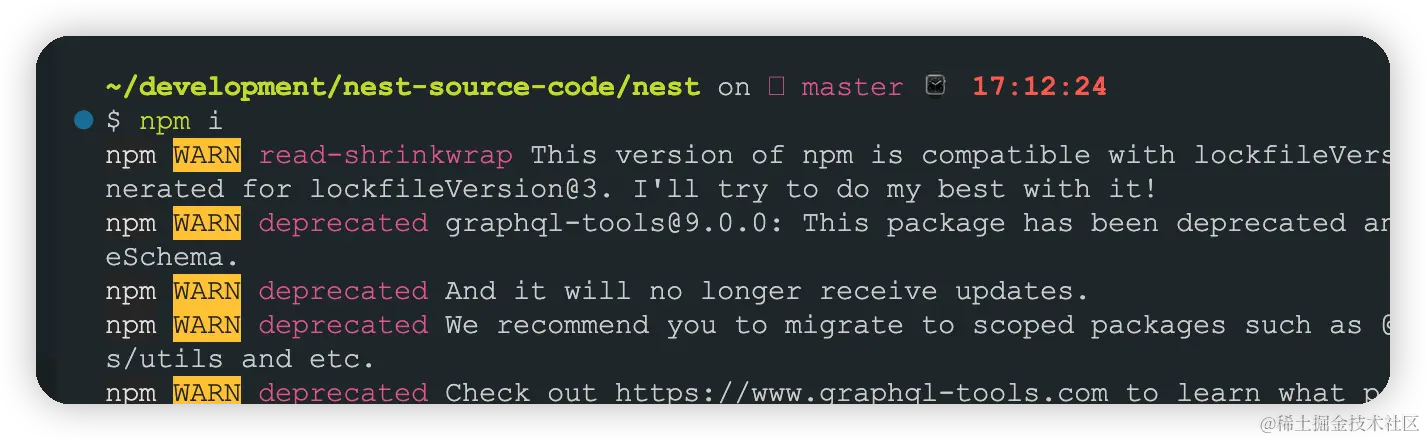 前面第一篇《Nest源码目录设计》里面提到samples里面有官方的案例项目,我们会通过里面的项目来调试源码,首先在根目录下运行npm install安装Nest源码需要的基本依赖。