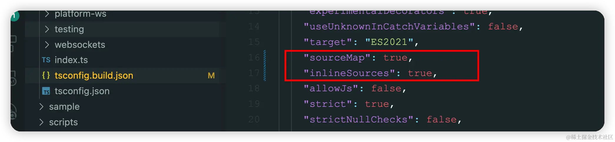 找到packages下的tsconfig.build.json文件,我们把sourceMap改为true,同时新增一个inlineSources,表示将源代码内嵌在生成的.map文件中,这样调试的时候就可以通过.map文件直接找到源代码。
