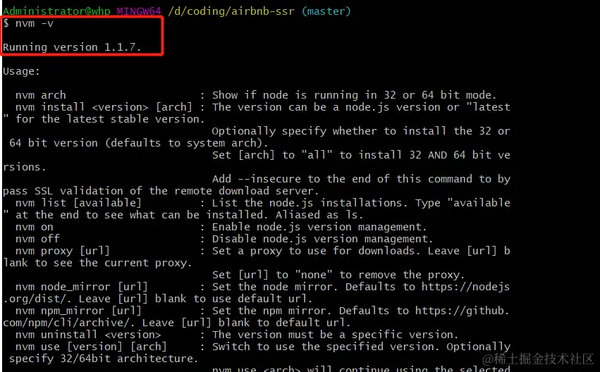 验证是否安装成功,可以在终端运行nvm -v查看版本,回车后,如果终端提示 Running version 版本号,则表示 nvm 已经安装成功,如图所示: