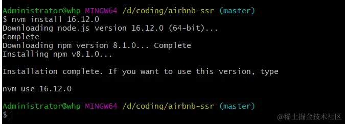 需要哪个版本的 node 环境,在终端运行nvm install 版本号,比如安装 16.12.0 版本,如图所示: