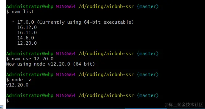 需要切换当前项目所依赖的 node 版本,使用命令nvm use 版本号,比如之前的版本是 17.0.0,现在需要切换成 12.20.0,在终端运行nvm use 12.20.0,继续执行node -v查看 node 版本后,显示版本号为 12.20.0 ,说明版本切换成功了,如图所示: