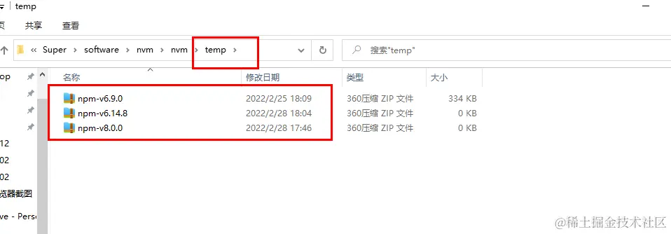 如果nvm下面的不同node版本文件下没有npm,这可能是网络环境原因(比如网速或者开了vpn代理),其实npm已经成功安装,在temp文件内,如图所示: