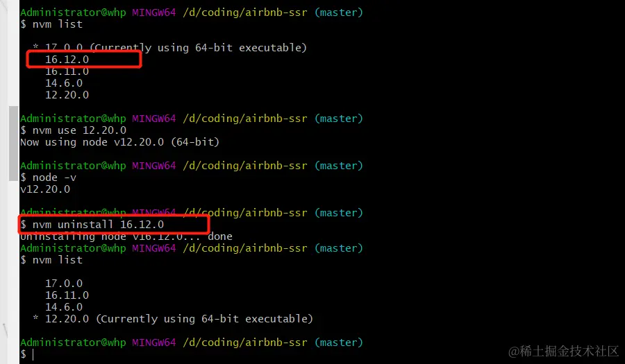在终端运行nvm uninstall 指定版本号,卸载掉 16.12.0 版本的 node,如图所示 :
