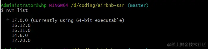 查看所有 node 版本,在终端运行nvm list查看版本,如图所示: