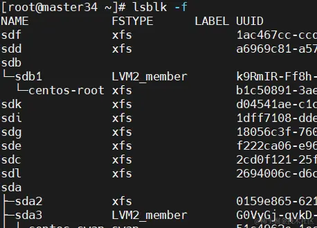 结果可以看到多数是xfs文件系统,且能查到UUID等信息。
