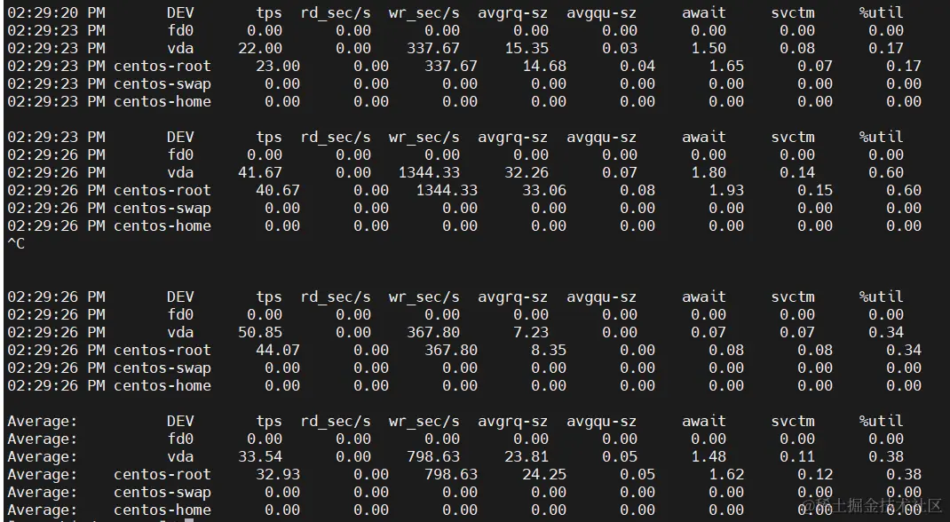 主要关注最后一列的使用率,也就是util,达到100%说明读写请求过多,具体什么负载高可以看前面几列的数据。