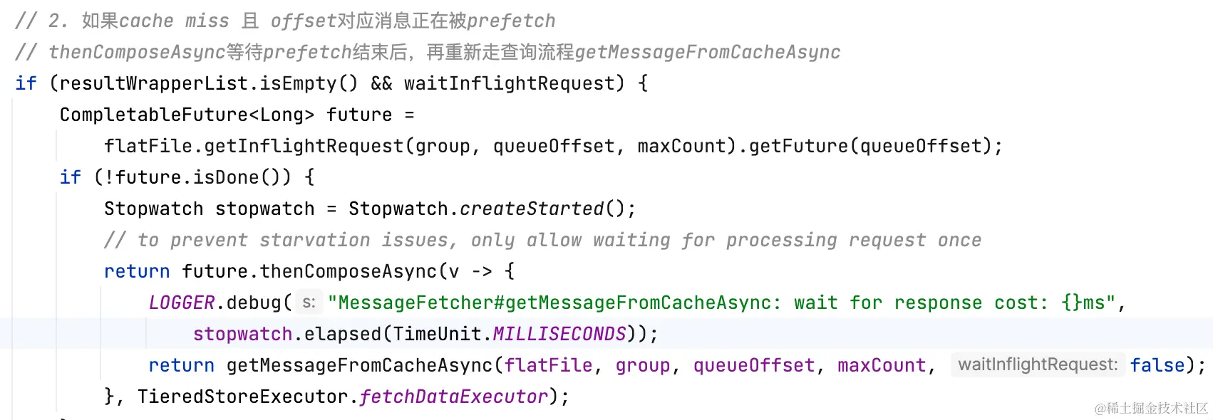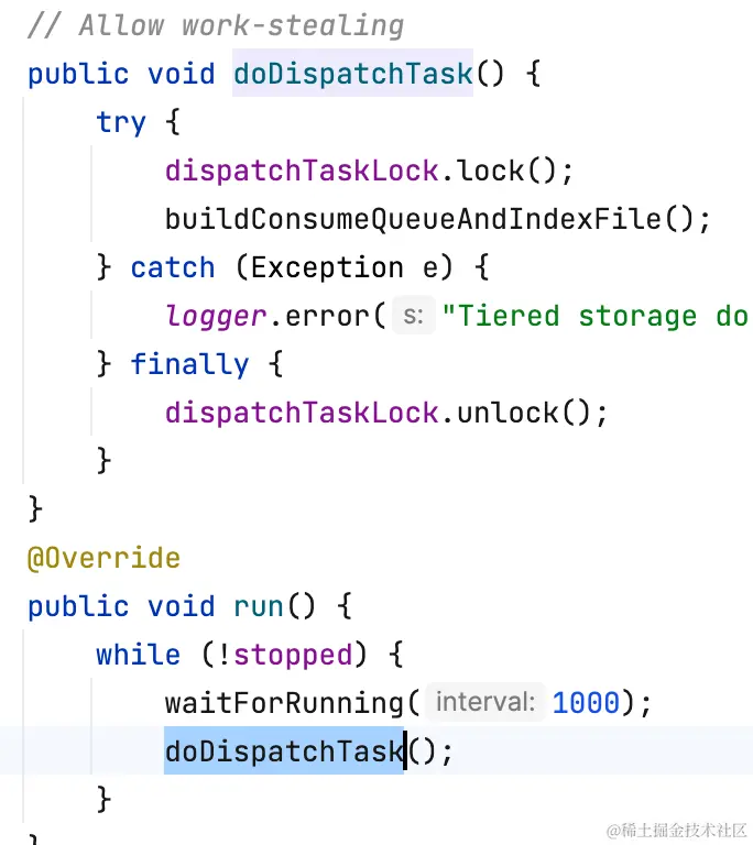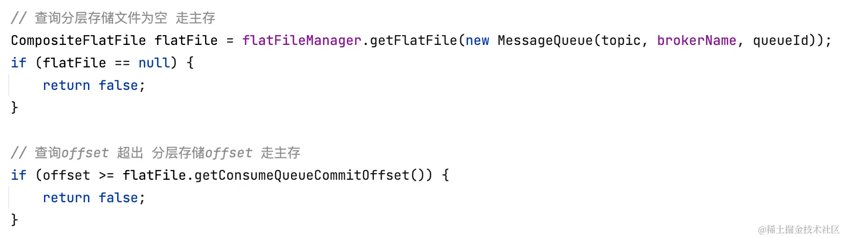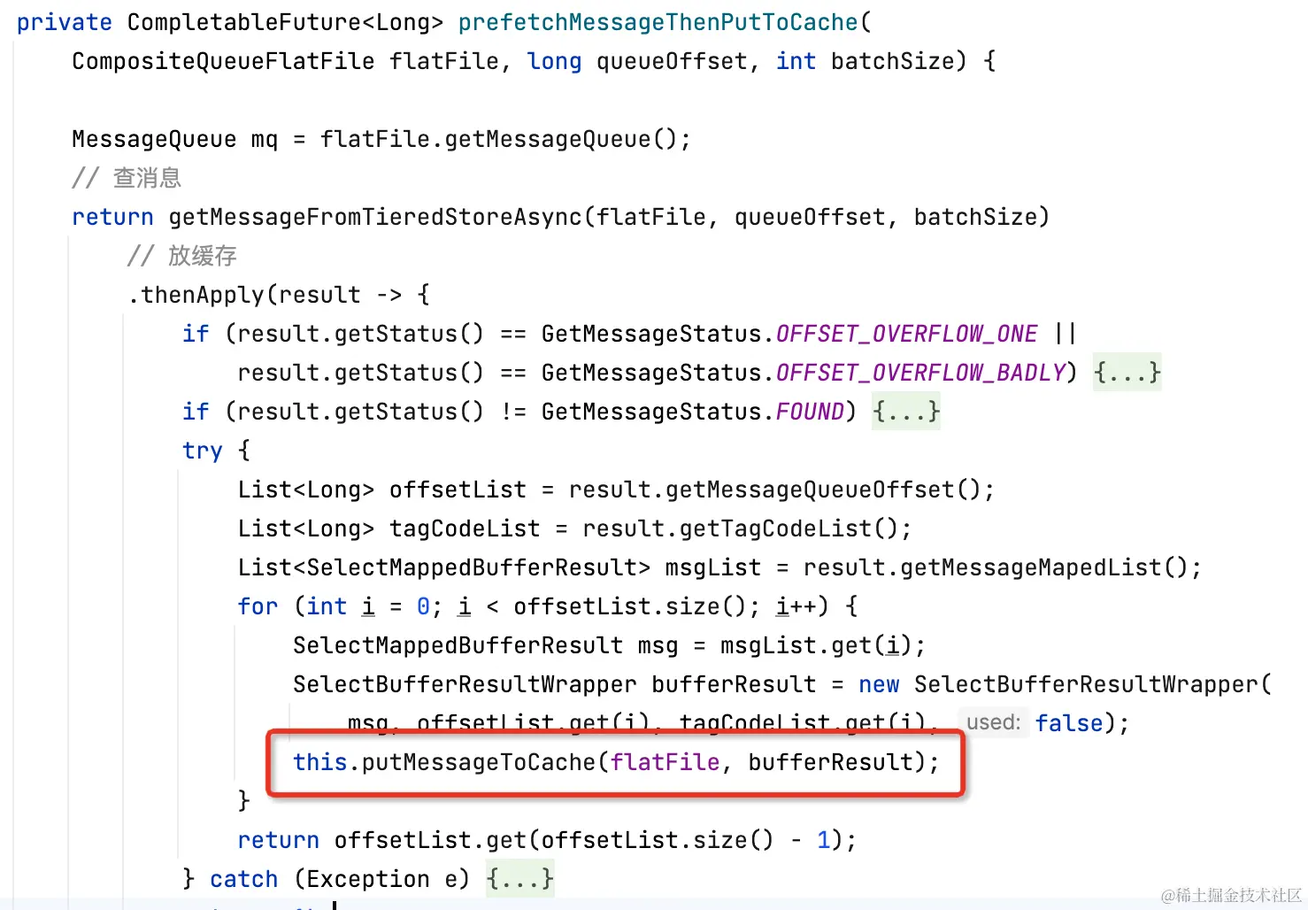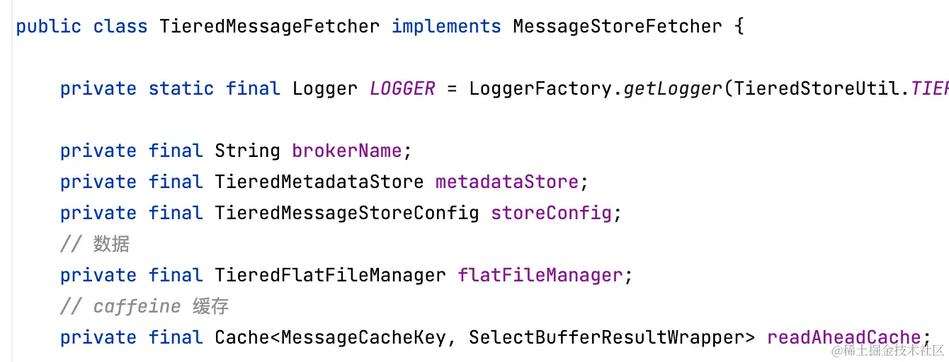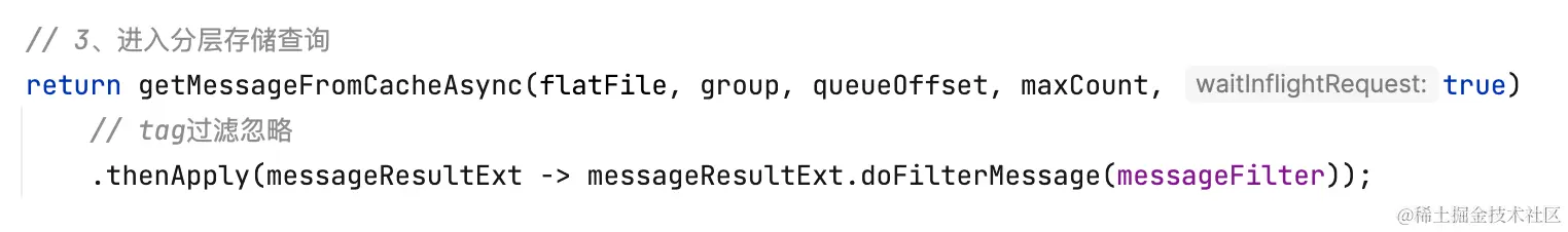 分层存储拉消息逻辑和Cache Aside类似,先读本地缓存(caffeine),如果缓存未命中,再走segment#read0(用户逻辑)读。