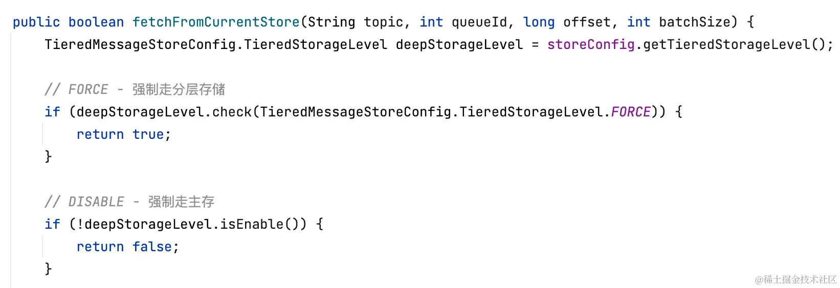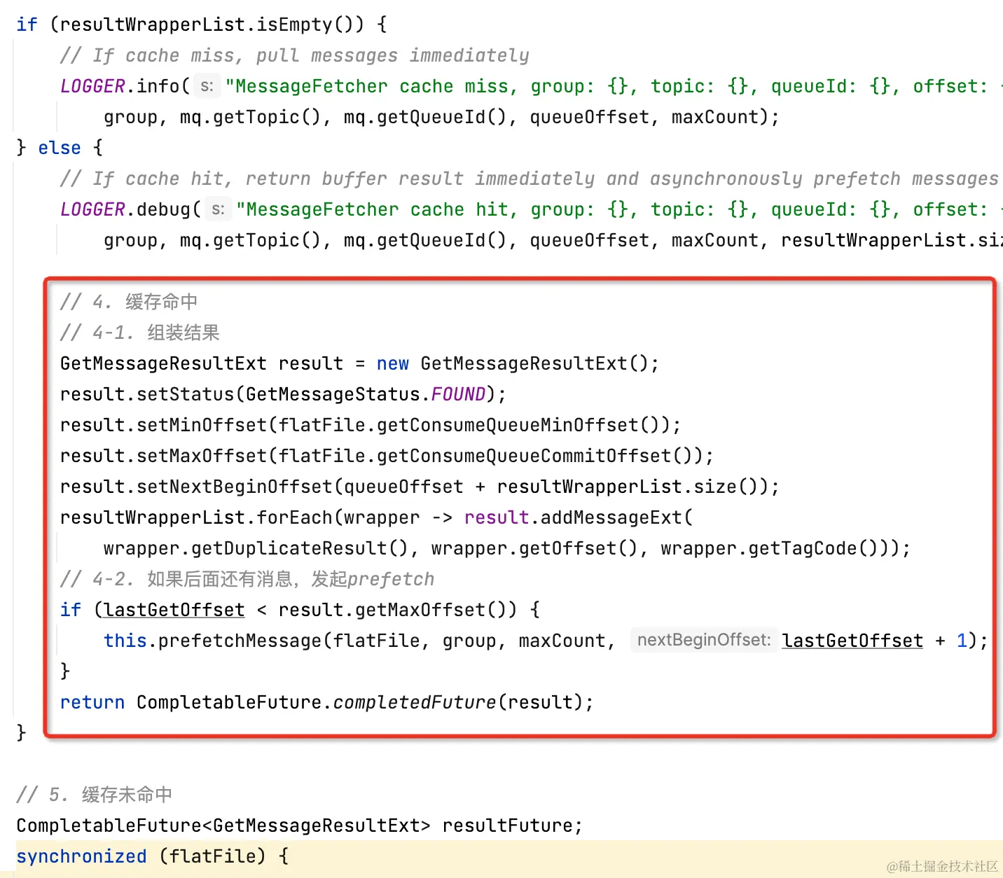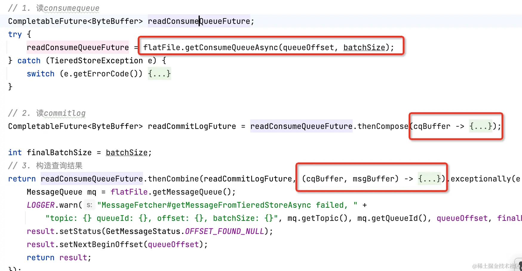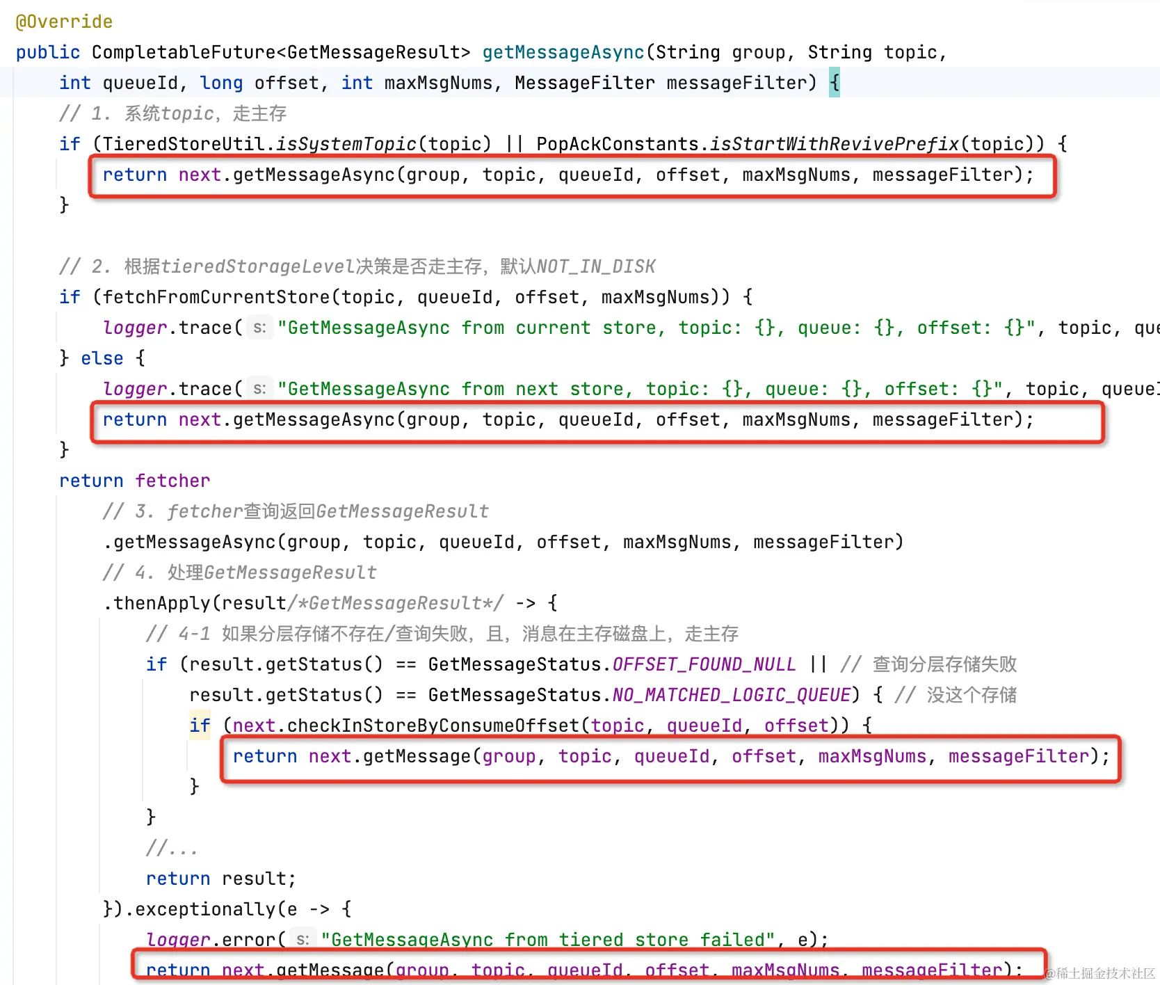 分层存储拉消息逻辑和Cache Aside类似,先读本地缓存(caffeine),如果缓存未命中,再走segment#read0(用户逻辑)读。
