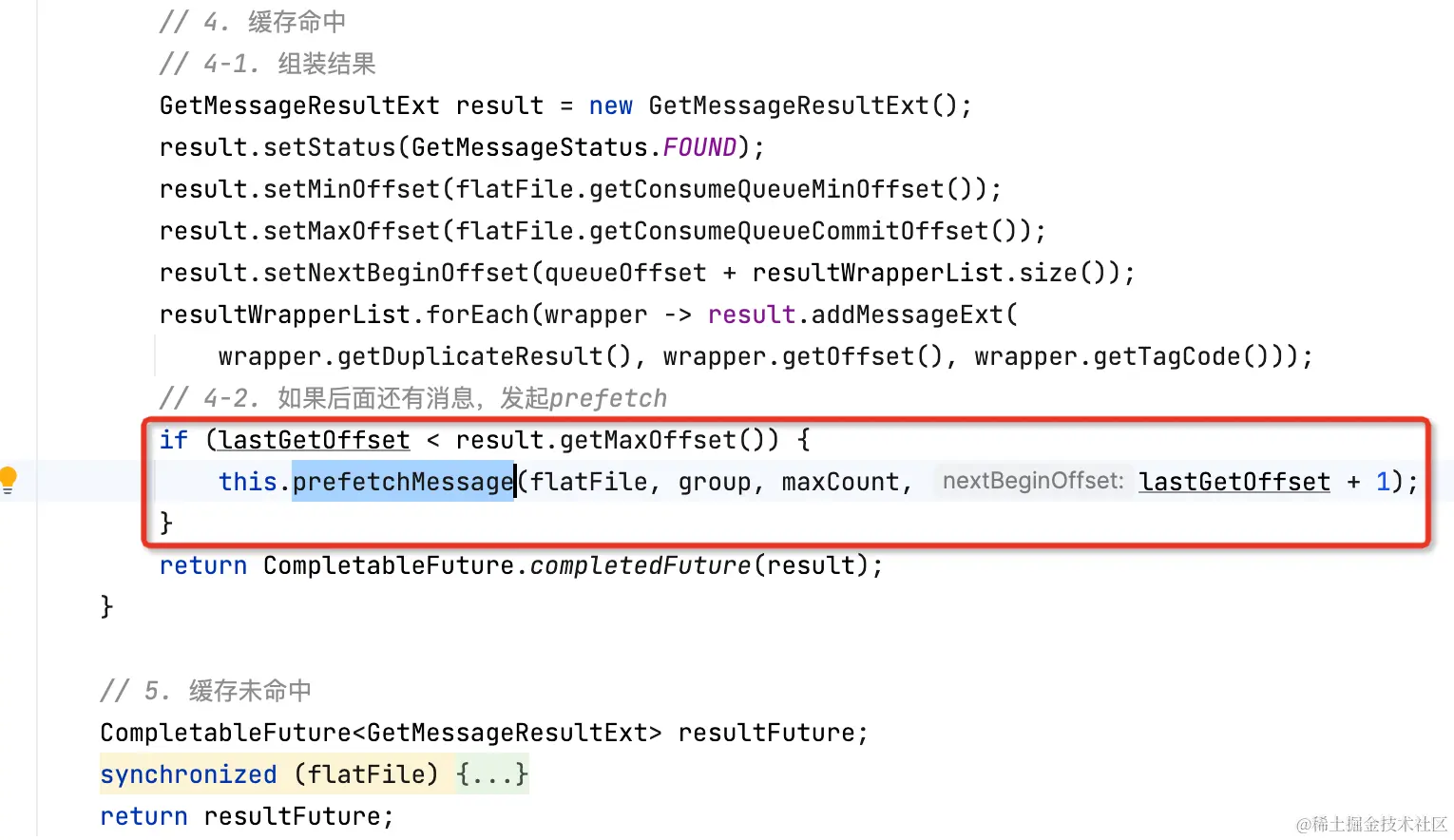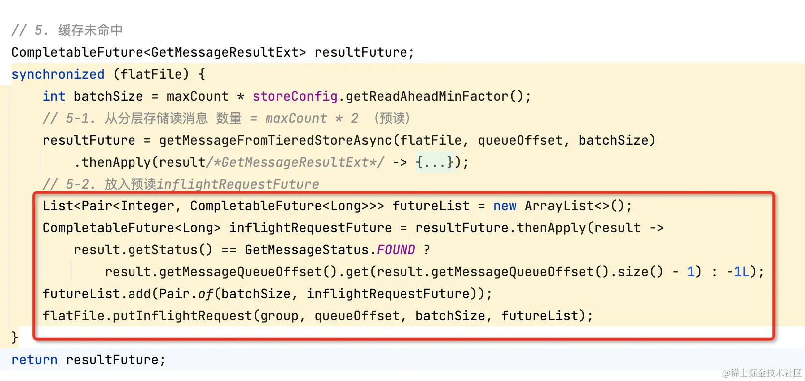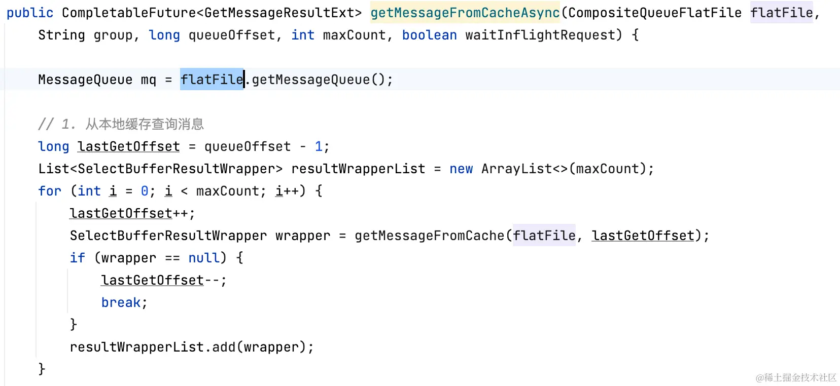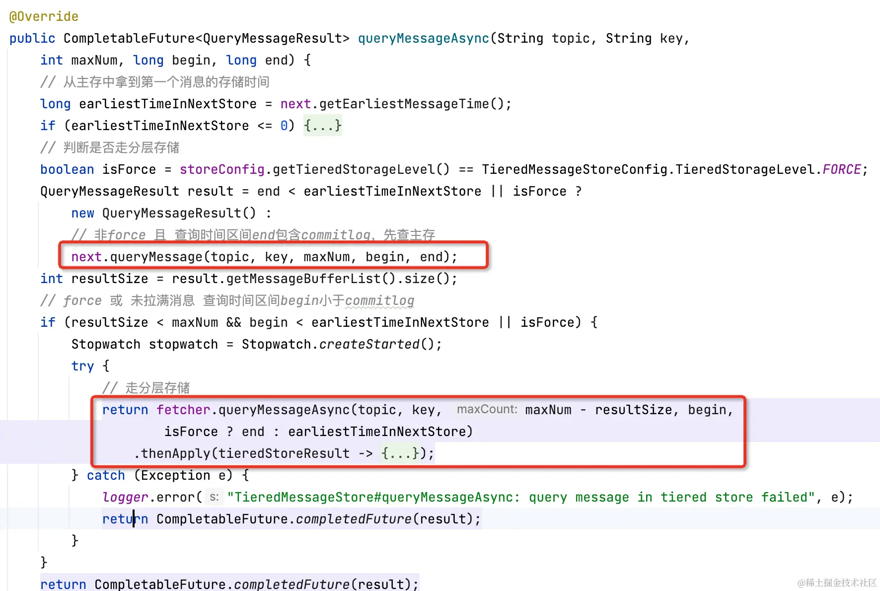分层存储拉消息逻辑和Cache Aside类似,先读本地缓存(caffeine),如果缓存未命中,再走segment#read0(用户逻辑)读。