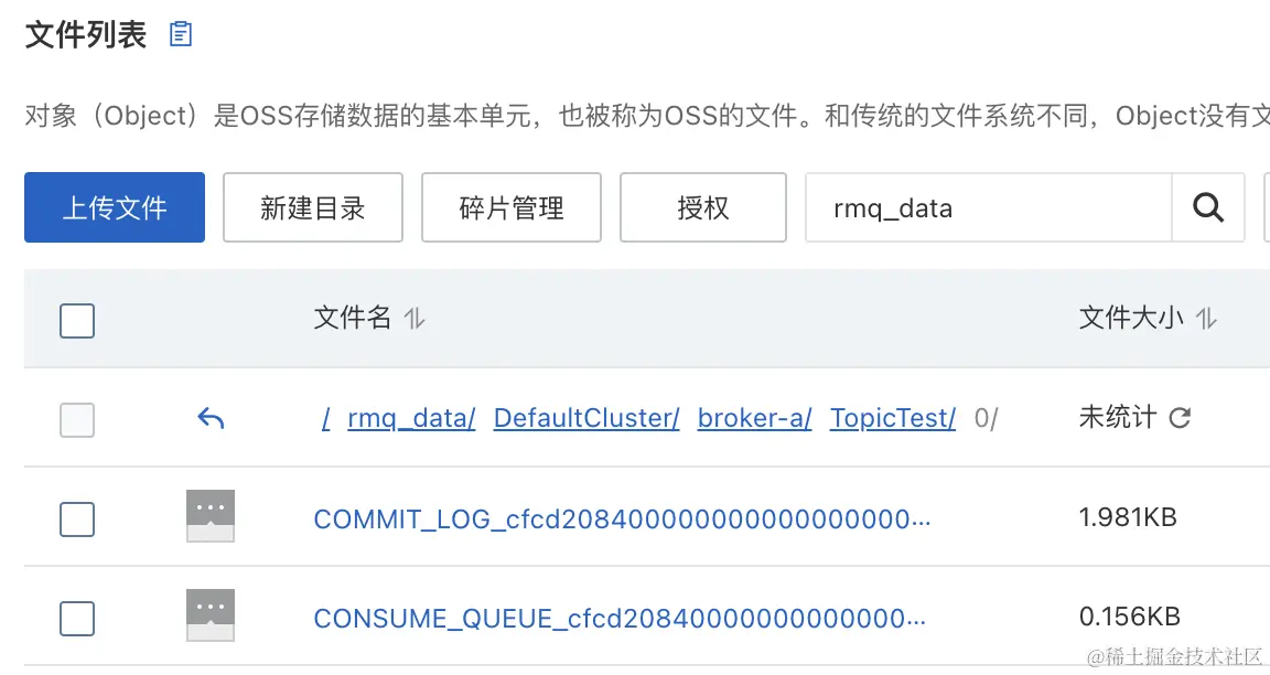 一个FlatFile包含三类文件commitlog、consumequeue、index(需要写满本地indexfile才能上传,所以这里没看到)。