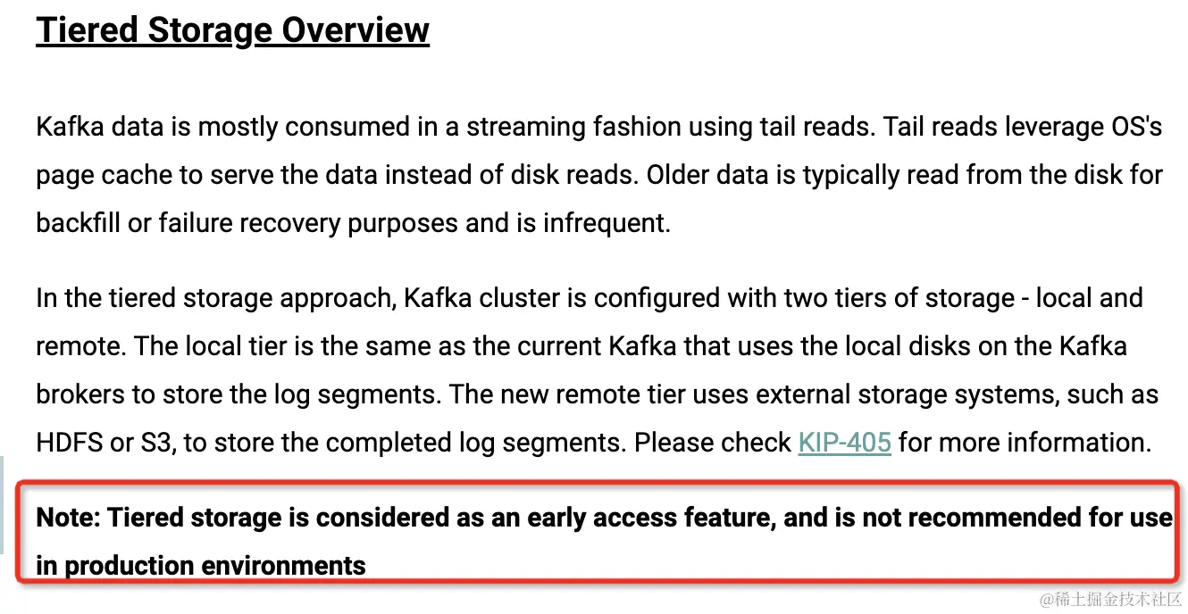 Kafka高级版本也支持分层存储,只不过官方不建议用于生产环境,仅仅作为预览特性。