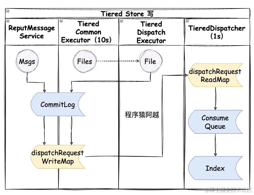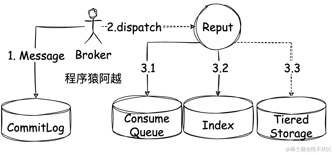 reput会触发分层存储写逻辑,过滤系统topic(如延迟topic、reviveTopic等),先写commitlog,再写consumequeue和index。