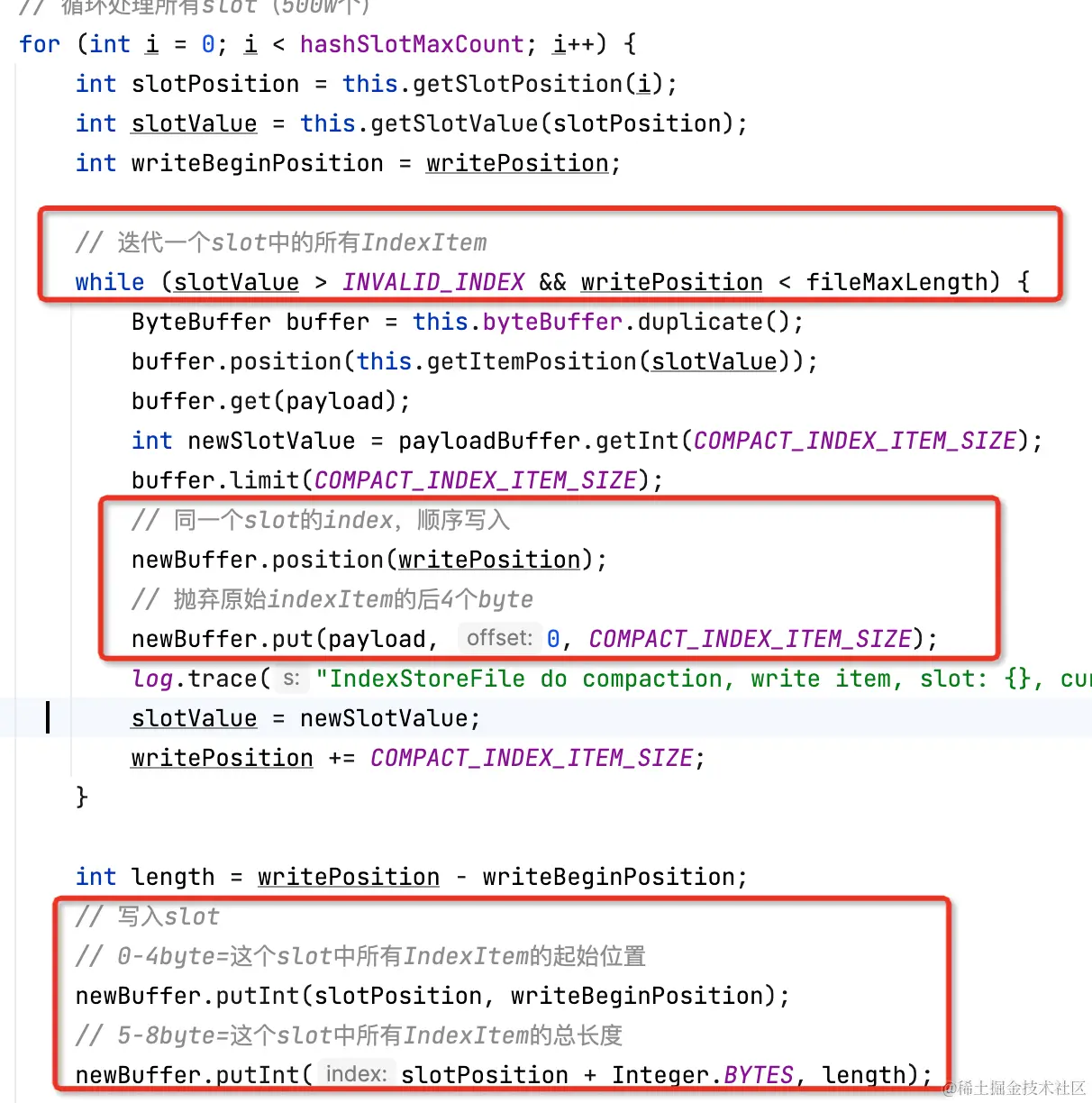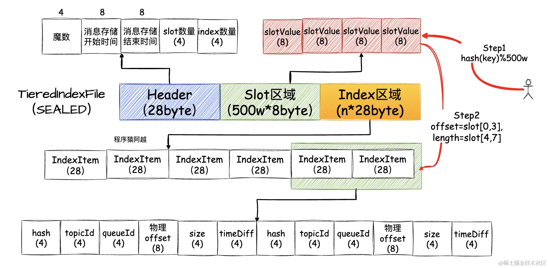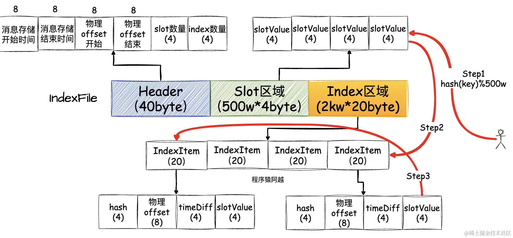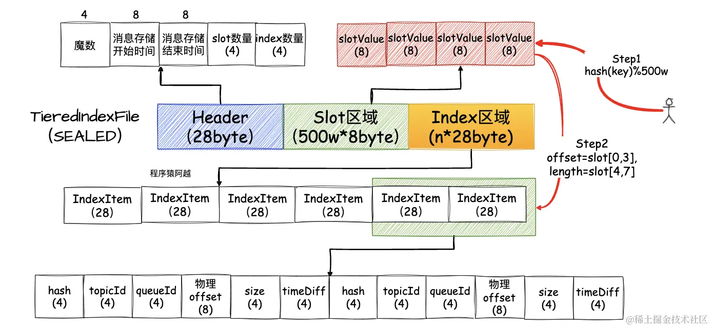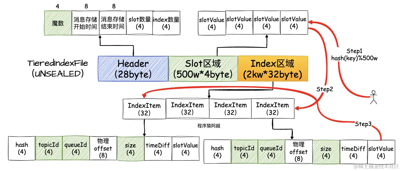按照非压缩格式存储的index文件的问题在于,假设根据业务key查询消息,业务key重复概率较高(比如同一个订单的消息)而导致哈希冲突,此时需要经过n次随机读才能完整读出一个slot下的所有索引项。
