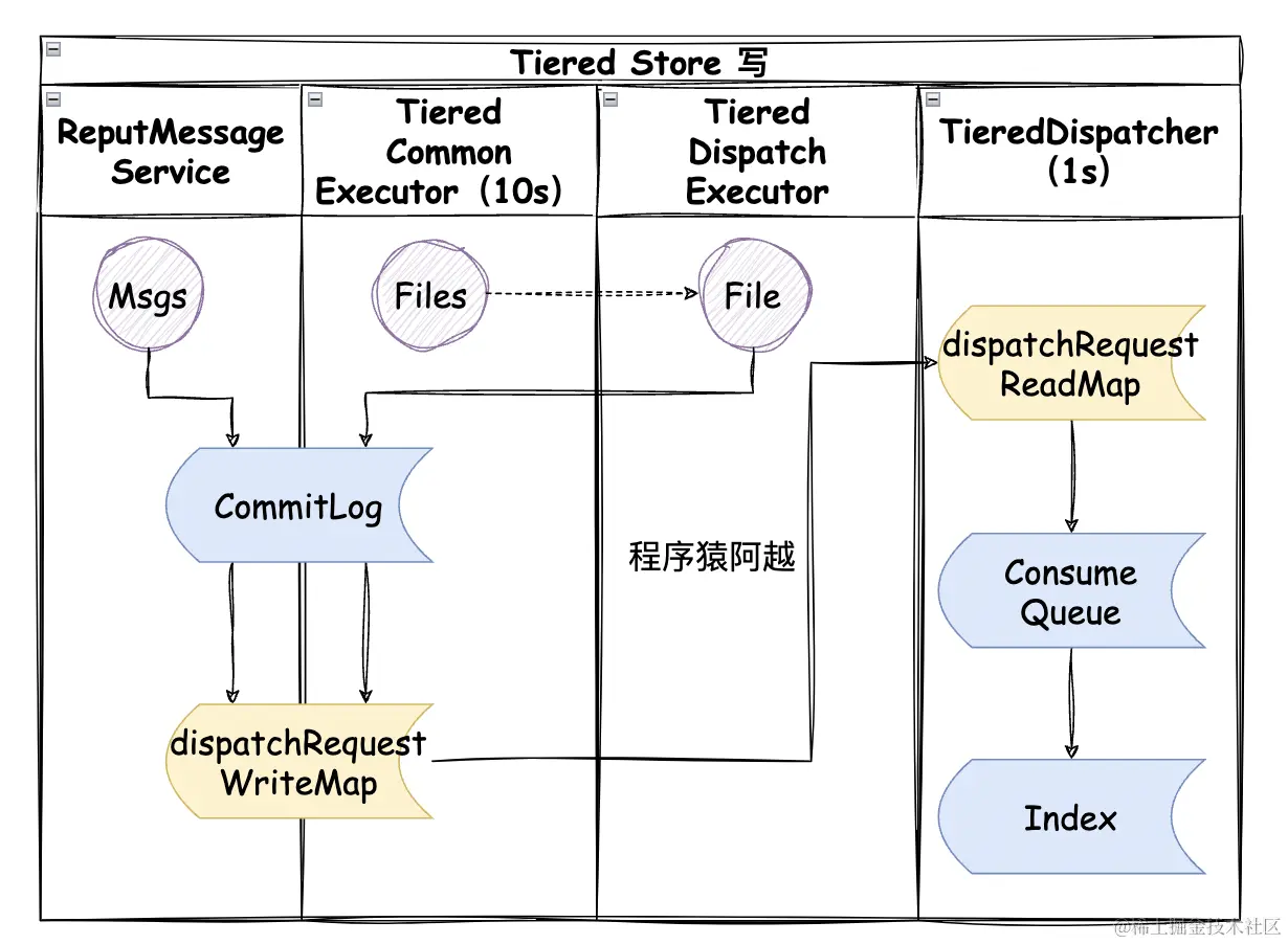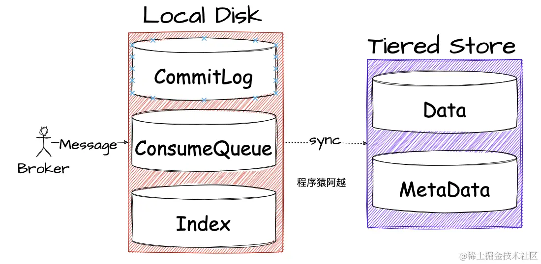 总的来说,分层存储就是将消息数据按照一定条件同步到另一个地方去,