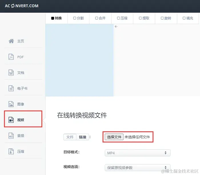 步骤2:进入到网站首页界面后,点击红色框选区域的 【选择文件】 按钮,将需要转换的视频文件上传进来。