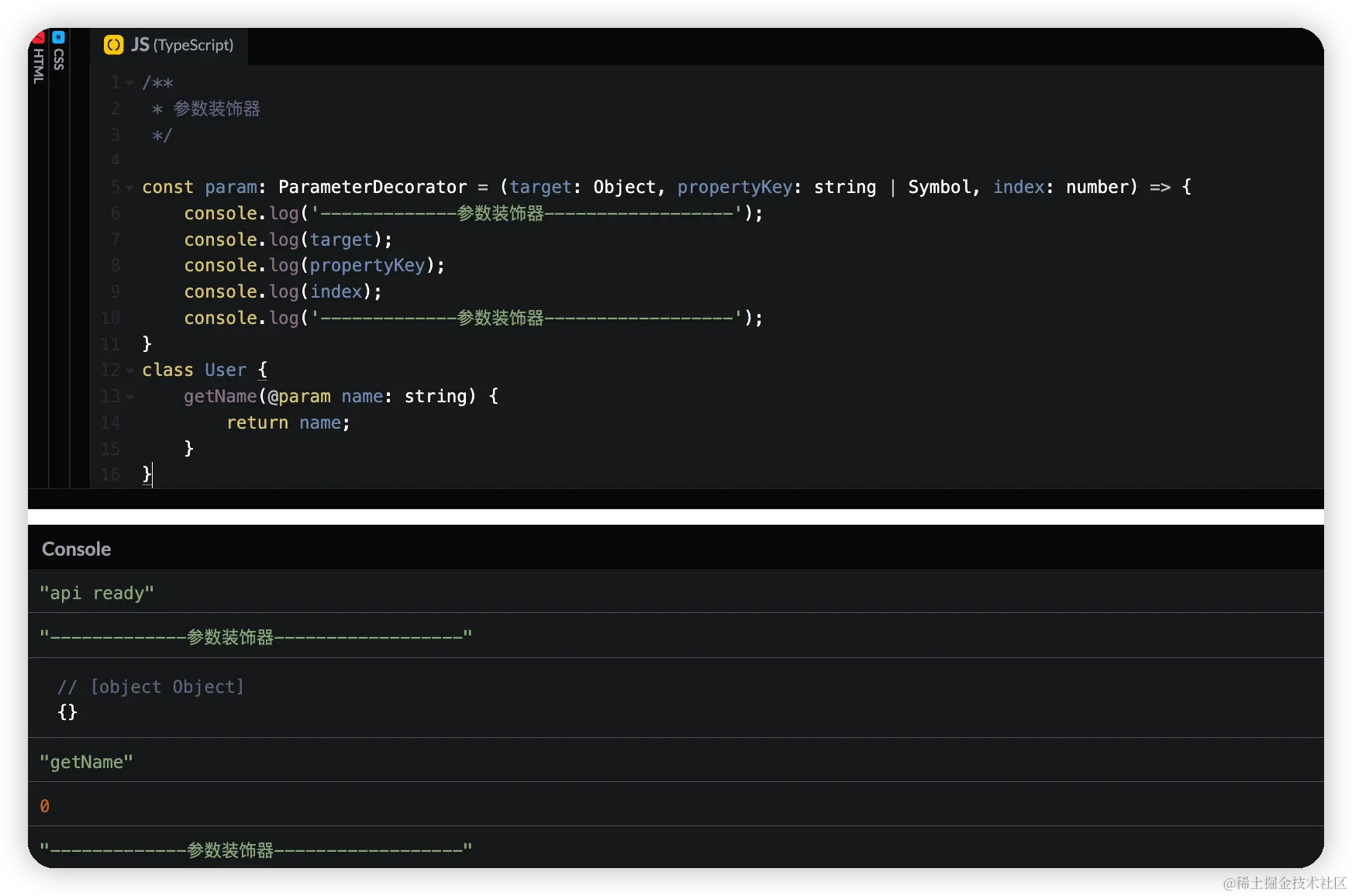 上面代码中,@param用于装饰类方法getName的参数,其中target为装饰类的原型,propertyKey为装饰的类方法,index为装饰方法的参数索引位置,来看看效果: