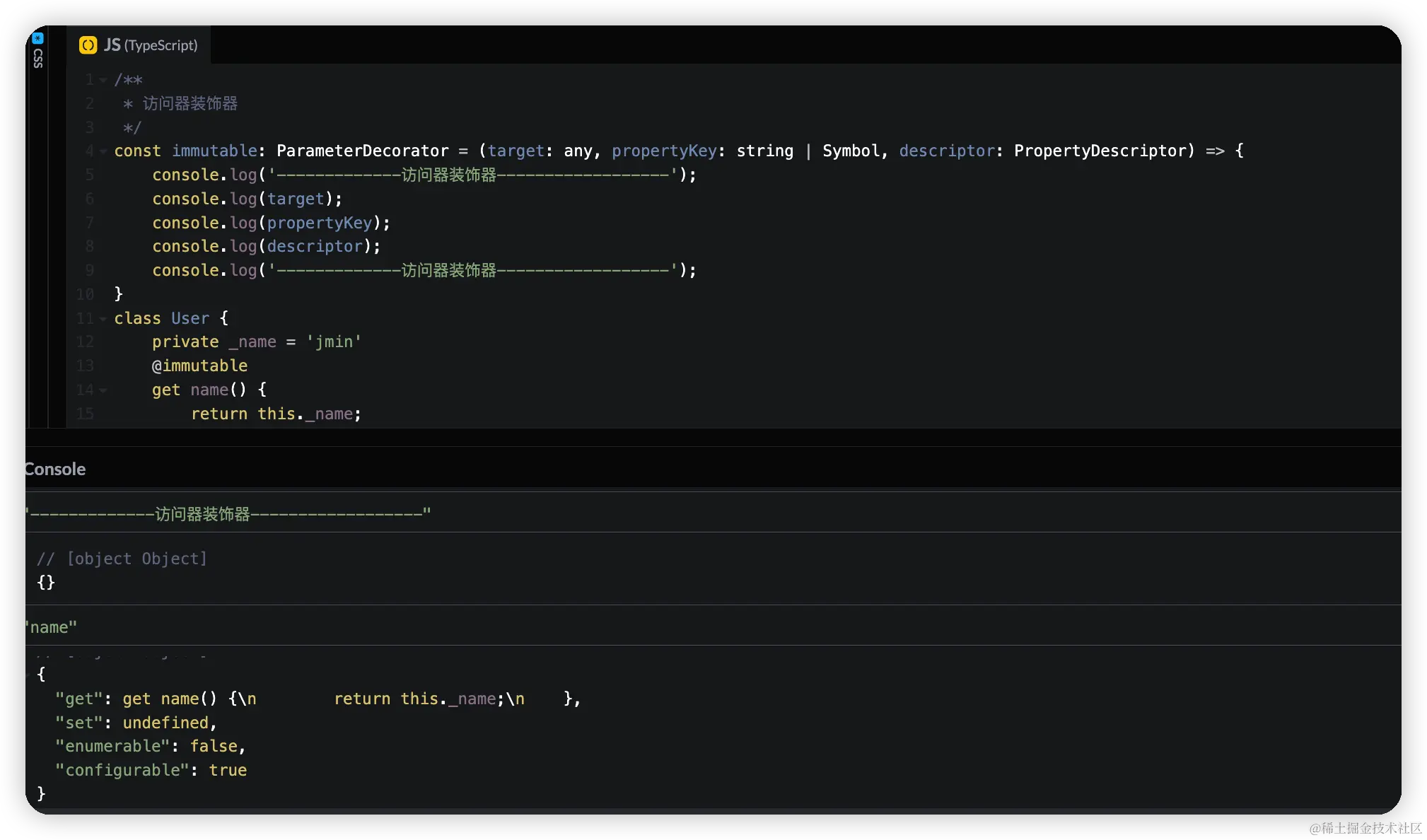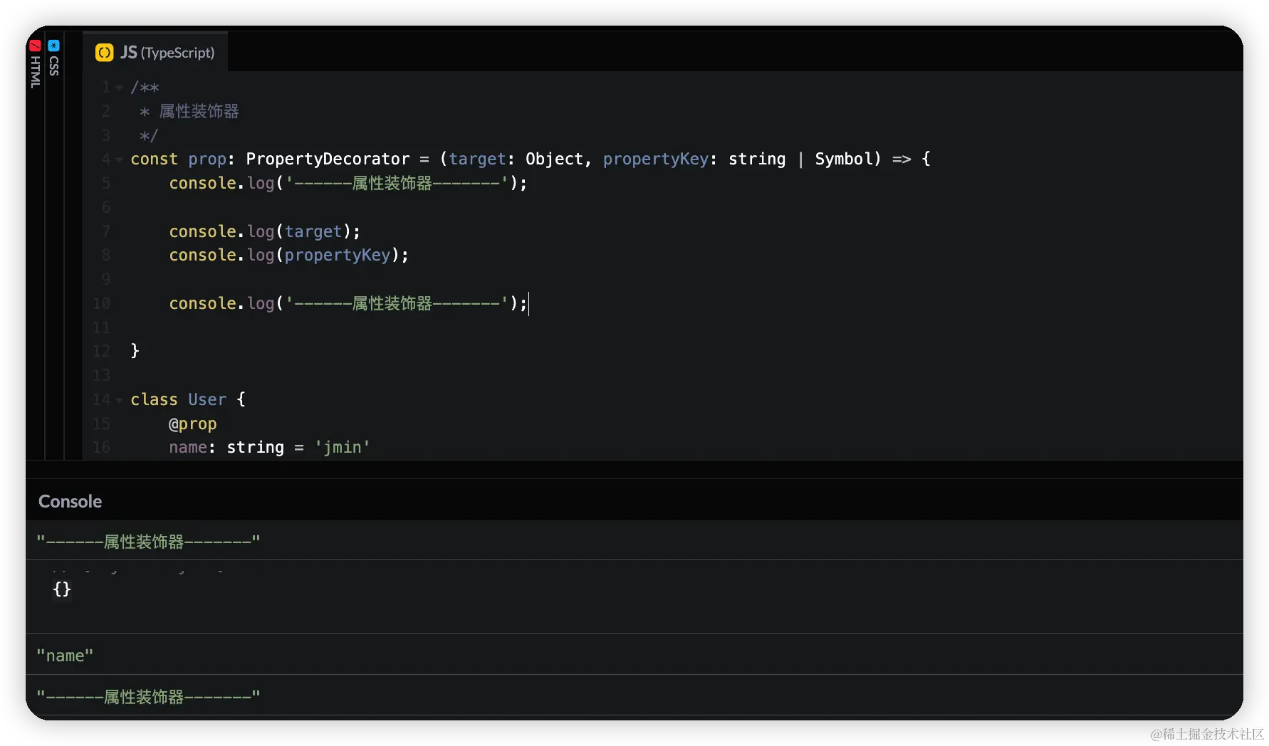 上面代码中,@prop用于修饰Use类的name属性,此时target为装饰类的原型对象,propertyKey为修饰的属性