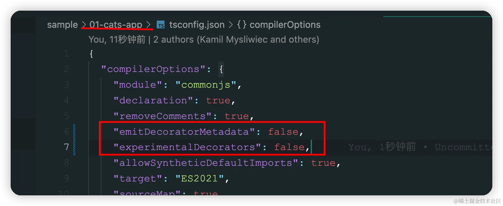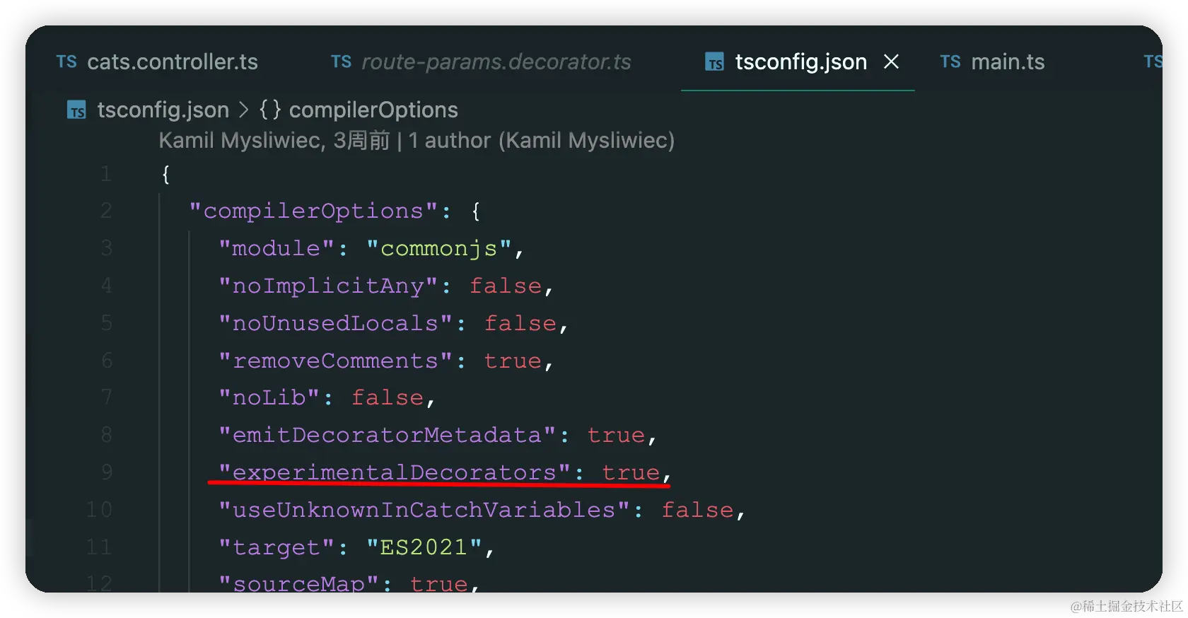 现在是不是对装饰器有更加清晰的认识了?我们再来看看Nest中tsconfig.json中的配置,默认开启了experimentalDecorators 配置,表示使用stage 1提案的装饰器