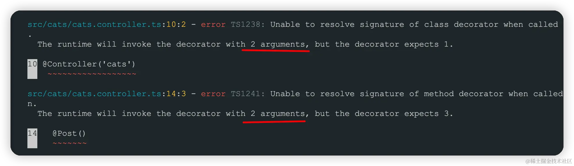 编译报错提示在运行时接收到了2个参数,实际上@Controller() 预期接收1个,而@Post() 预期接收3个,明显是使用了stage 3最新提案的参数。