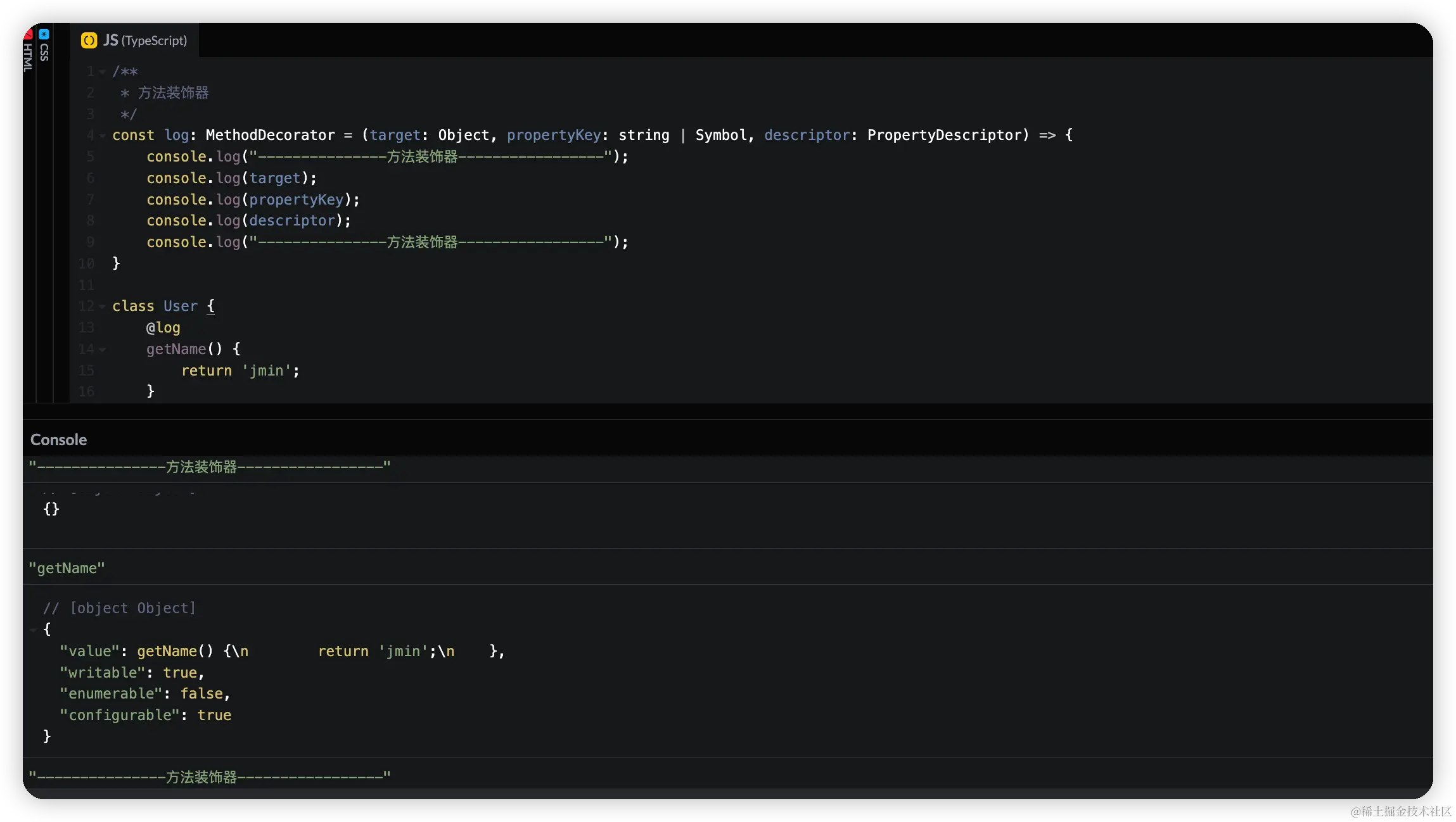 上面代码中,@log装饰器函数修饰User类方法getName,其中target为‘装饰’类的原型,上例是User.prototype,由于这时候类还没有被实例化,只能去装饰原型对象,这是不同于类装饰器的,来看看运行效果: