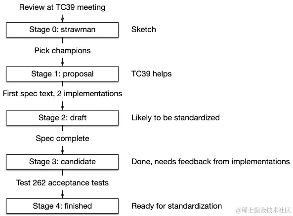 我们要知道,一个JavaScript特性正式进入规范是需要经历下面五个阶段,从 Stage 0(Strawman,初稿)开始,经 Stage 1(提案)、Stage 2(草案)、Stage 3(候选提案),最后到 Stage 4(Finished,过审提案)结束。