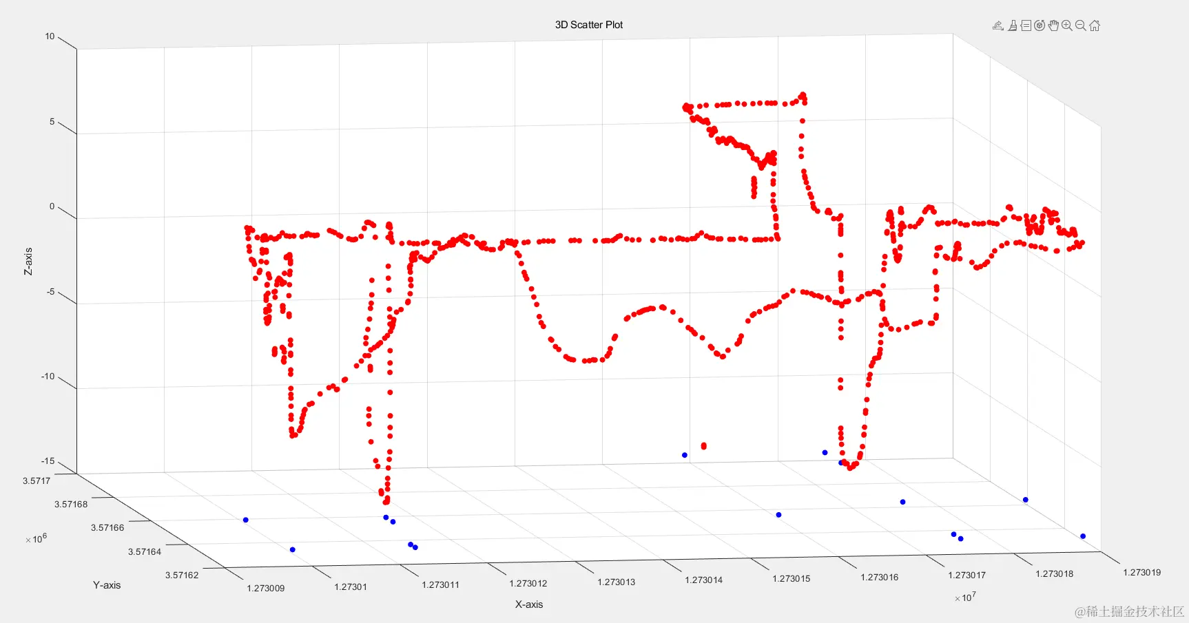 由于分割点分布在模型的边缘,因此想要构建模型的四周墙面,需要利用分割点和建筑底部点,由于底部点不清晰,因此可以借助多边形的点,由于多边形在xy平面内,将该多边形沿Z轴平移到模型最底部,即可成为模型底部的范围点。