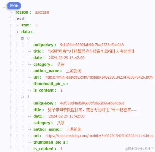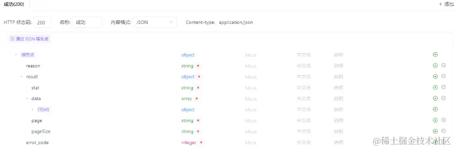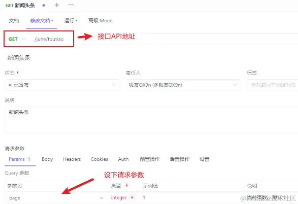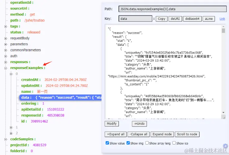 接着就是 对字段,将 接口详情返回的数据 跟 修改接口的请求参数 关联上,请求下聚合数据的新闻头条数据,更新下responseExamples字段,具体代码如下: