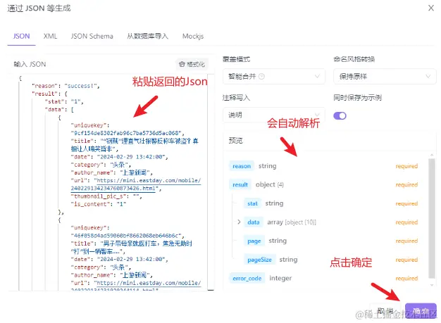 粘贴聚合数据接口返回的json,会自动解析生成对应字段,然后点击 确定: