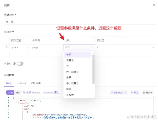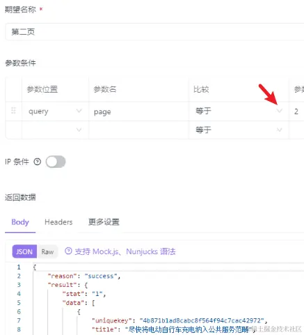 点击 新建期望,设置下 参数条件,比如,设置url里的page为1和2,分别返回不同的数据:
