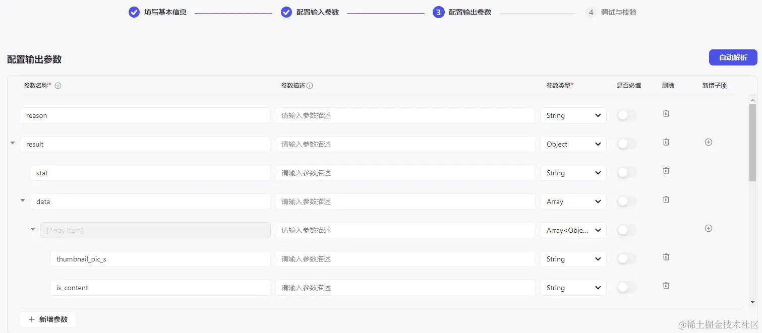 - 配置输出参数: 点击 新增参数,完成相关配置:参数名称、参数描述、参数类型、是否必填。也可以点击右上角的 自动解析 来自动生成输出参数,注:只支持JSON类型的返回数据!!!