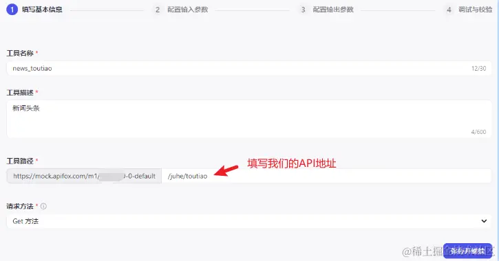 - 填写基本信息:工具名称、工具描述、工具路径(API接口)、请求方式(GET、POST等);