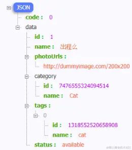 然后就可以 访问到我们定义的API接口 了,点击复制URL,加上 pet/1,回车发起请求,可以看到返回的数据: