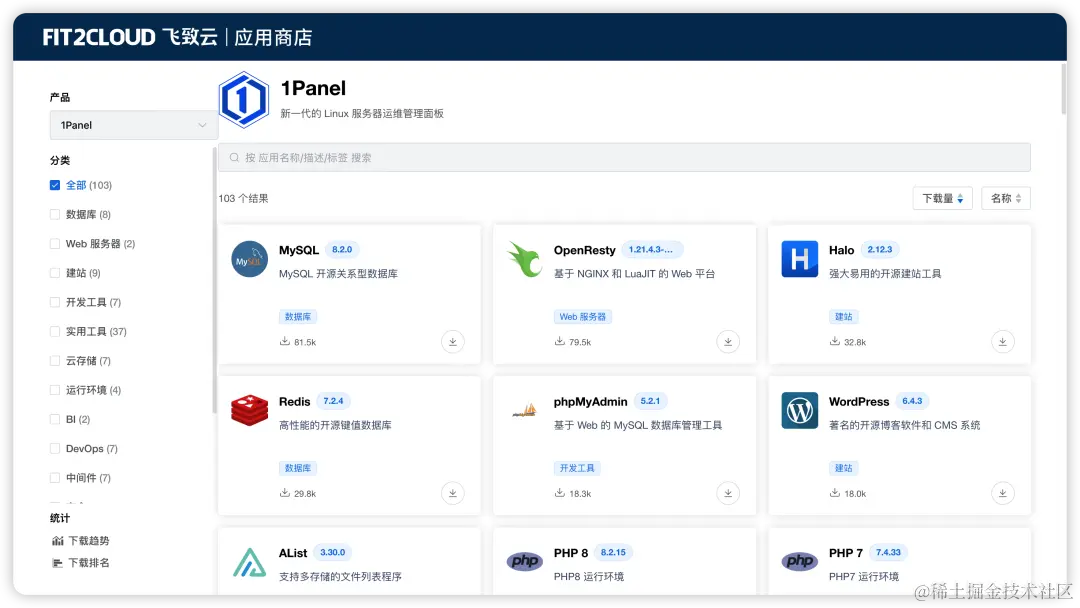 1Panel所推出的应用商店(apps.fit2cloud.com/1panel)有效解决了个人或者企业用户服务器开源应用软件选择难、安装难的问题。目前1Panel应用商店已经上架了超过100款高质量的开源应用软件,涉及建站、数据库、Web服务器、运行环境、实用工具、云存储、AI、BI、安全等类别,能够满足个人或者企业用户不同使用场景下的实际需求。