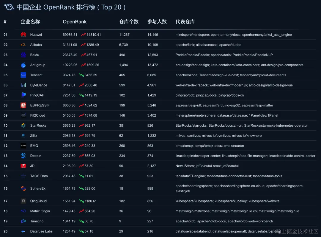 ▲ 图2 中国企业OpenRank排行榜(数据来源:《2023 中国开源年度报告》)