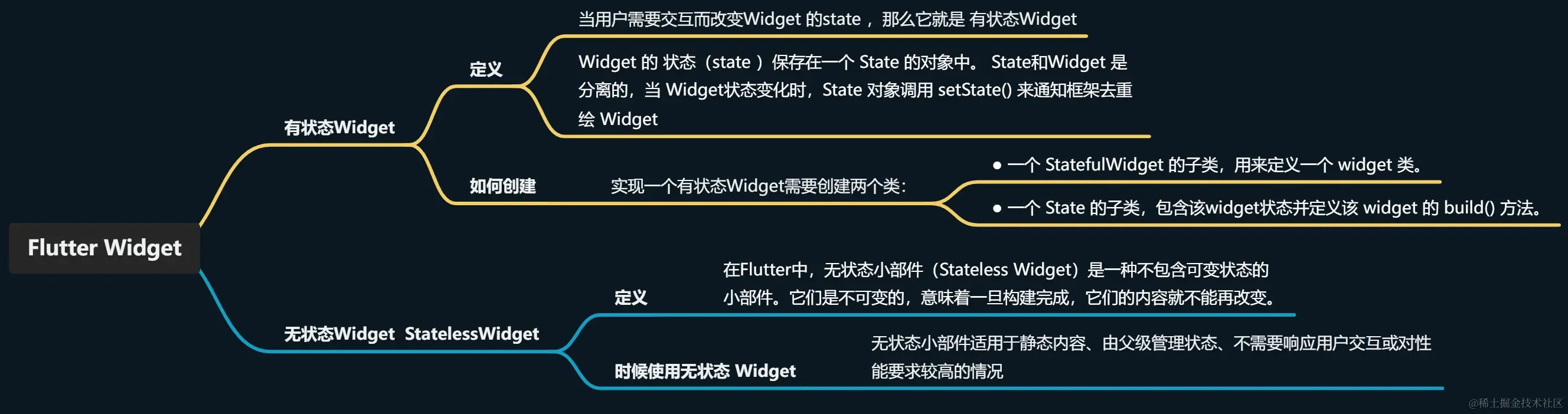 - 当小部件的内容是静态的,不需要根据外部事件或数据进行更新时,可以使用无状态小部件。例如,一个简单的文本展示小部件或一个静态的图标按钮。