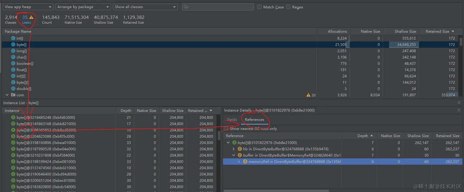 leaks 是泄漏的对象个数,双击可以查看具体对象, 以及该对象的引用链
