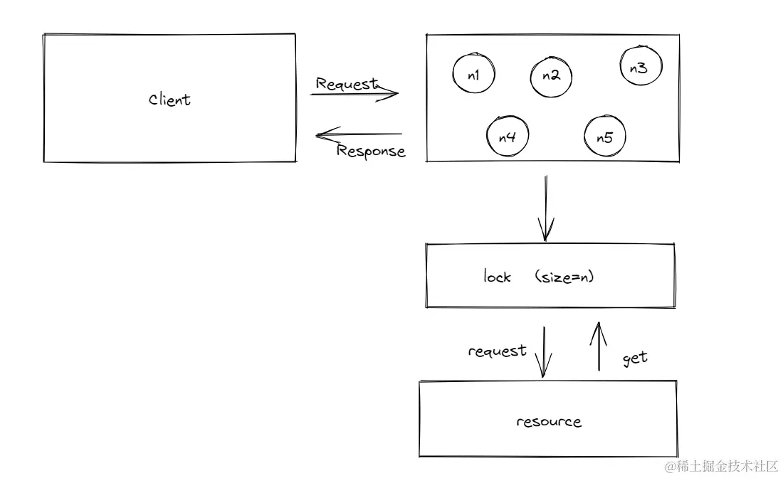 如图,系统中的多个结点通过分布式锁请求资源,然后才能够处理请求,作出相应,这里同时只能有N个结点拿到锁,从而拿到需要的资源,比如数据库连接等等。