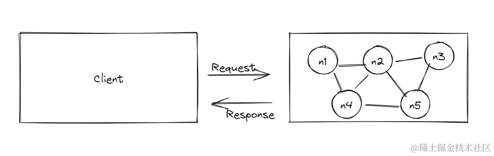 如下图所示,服务中的每一个结点对外来说,都是相等的,n1-n5在客户端的感知中没有任何区别。