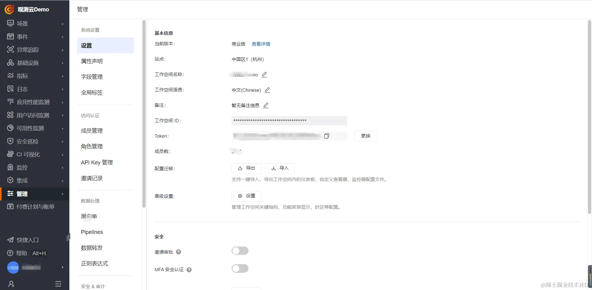 1)在「观测云控制台」-「设置」,复制 Token 信息