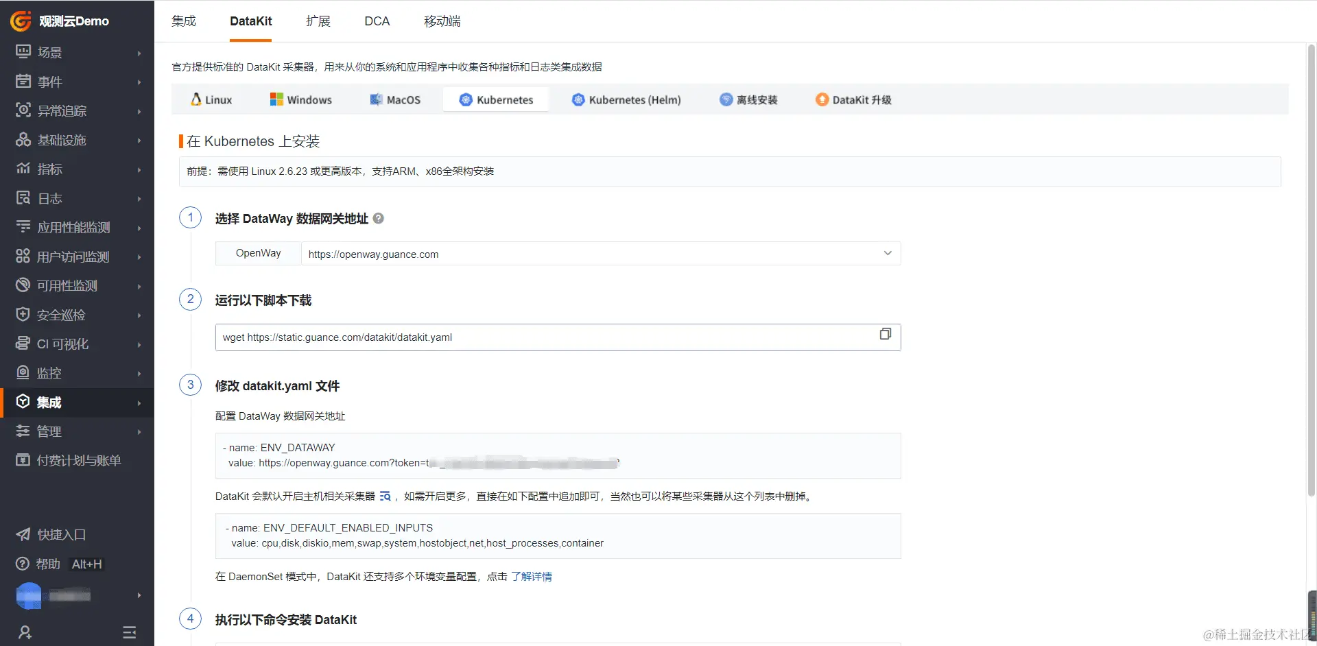 登录观测云控制台,选择「集成」-「DataKit」-「Kubernetes」,按照所提示的安装步骤下载 datakit.yaml 。
