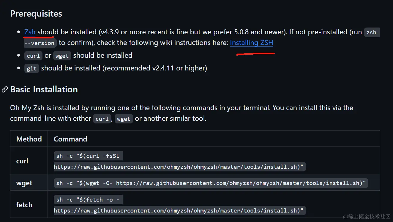 要想拥有一个这样的终端,就要先安装zsh,先按照提示安装zsh,安装完之后再选择curl或者wget等方式安装oh my zsh