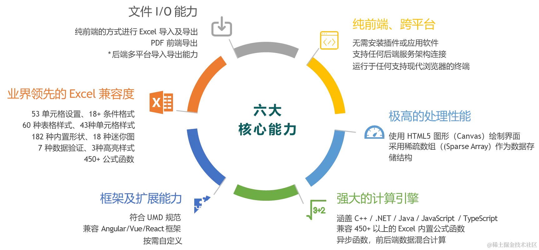 除此之外,针对文档加载及公式计算,SpreadJS同样能够提供良好的性能。SpreadJS支持纯前端导入Excel文件,针对大体量Excel文档,能够支持懒加载、增量加载等能力,提升用户体验。在公式计算模块,SpreadJS支持纯前端百万级数据量的秒级渲染能力,并可以以接近原生Excel的性能加载实现百万级数据和计算公式的使用。同时,还提供懒加载,异步公式等前后端结合的方案来进一步优化加载和计算性能,提升操作体验。