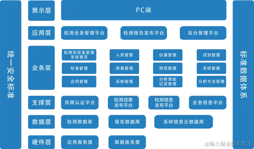 数字化LIMS应用管理系统主要包含数据层、支撑层、业务层及应用层。其中,数据层主要包括检测数据库、报告数据库以及采样信息云数据库;支撑层包括权限认证平台、检测结果发布平台、检测信息发布平台、业务信息平台;业务层包括:标准管理、合同管理、人员管理、质量管理、采样管理、仪器管理、绩效管理、分析原始记录管理、试剂管理、分析方法管理、系统管理等;应用层主要包括:检测业务管理平台、检测报告发布平台、后台管理平台。除此之外,数字化LIMS应用系统还提供标准数据体系和统一安全标准,确保数据的准确性、一致性和规范性。