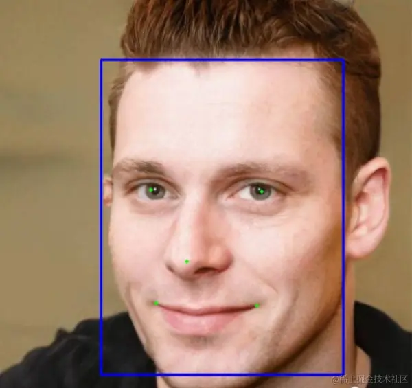 可以看到上图不仅用蓝框标出来人脸的区域,而且还标出来嘴巴和鼻子的位置。