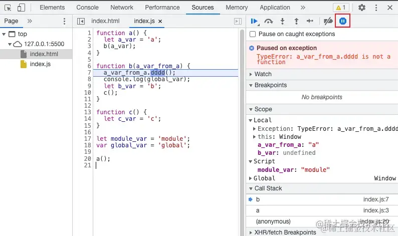 还可以勾选这个 Pause on caught exceptions,效果是错误被捕获时,打断点: